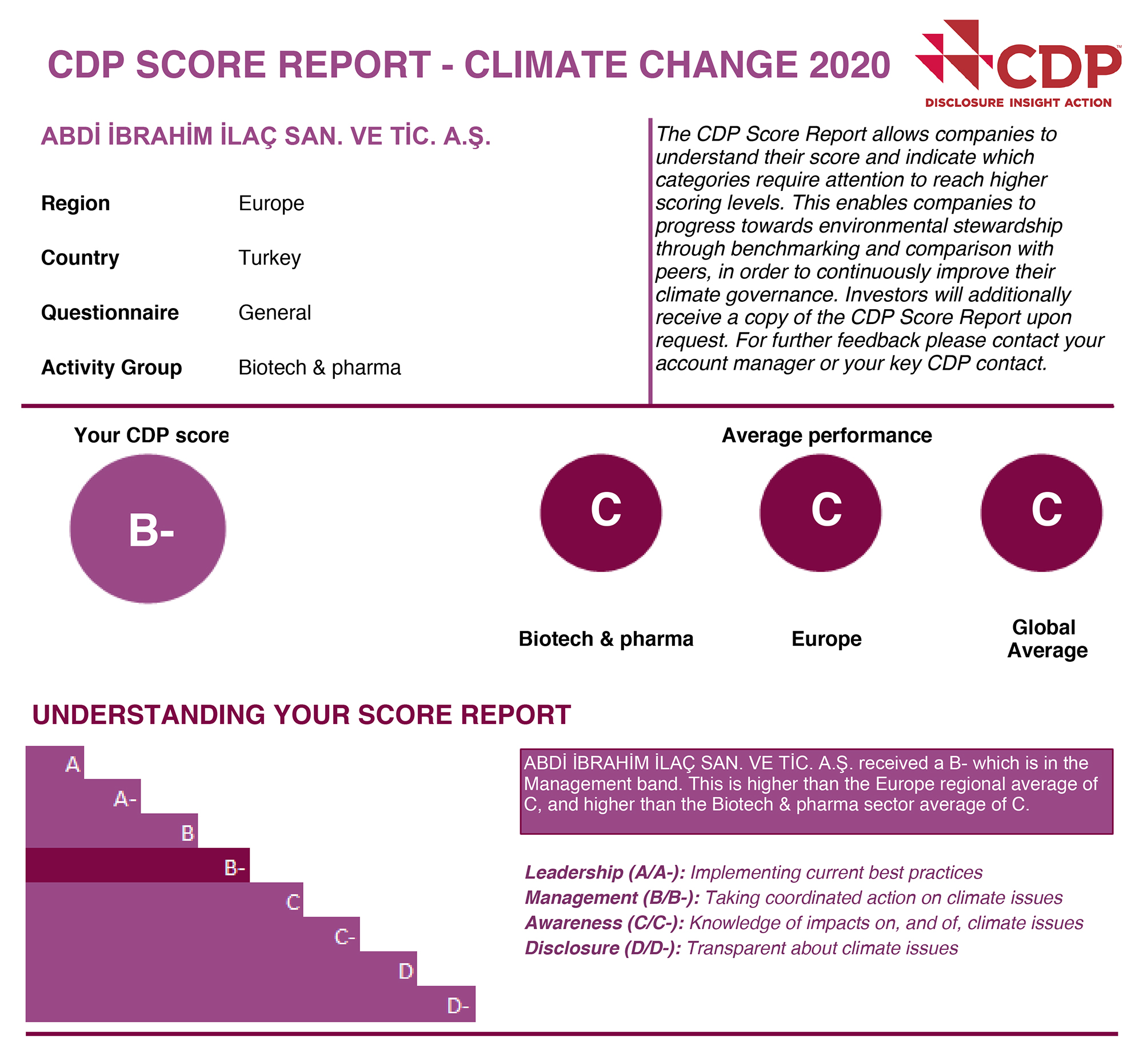 For the first time in 2020, we reported our climate change management as well as water management accomplishments as part of the Carbon Disclosure Project’s Climate Change and Water Security Programmes. We are extremely proud to earn a place in the B- list by outperforming the global and European average score in the Biotechnology & Pharmaceuticals industry category. This marks a significant accomplishment in the Carbon Disclosure Project, a platform harbouring near 10,000 companies worldwide and the largest environmental data in the world. As a first-time applicant, we have managed to get graded, outperforming 95 of 129 applicants in Turkey, most of whom had 5 to 10 years' experience in this aspect. We have room for improvement in both categories. Our ultimate goal is to make it to the A-list companies.